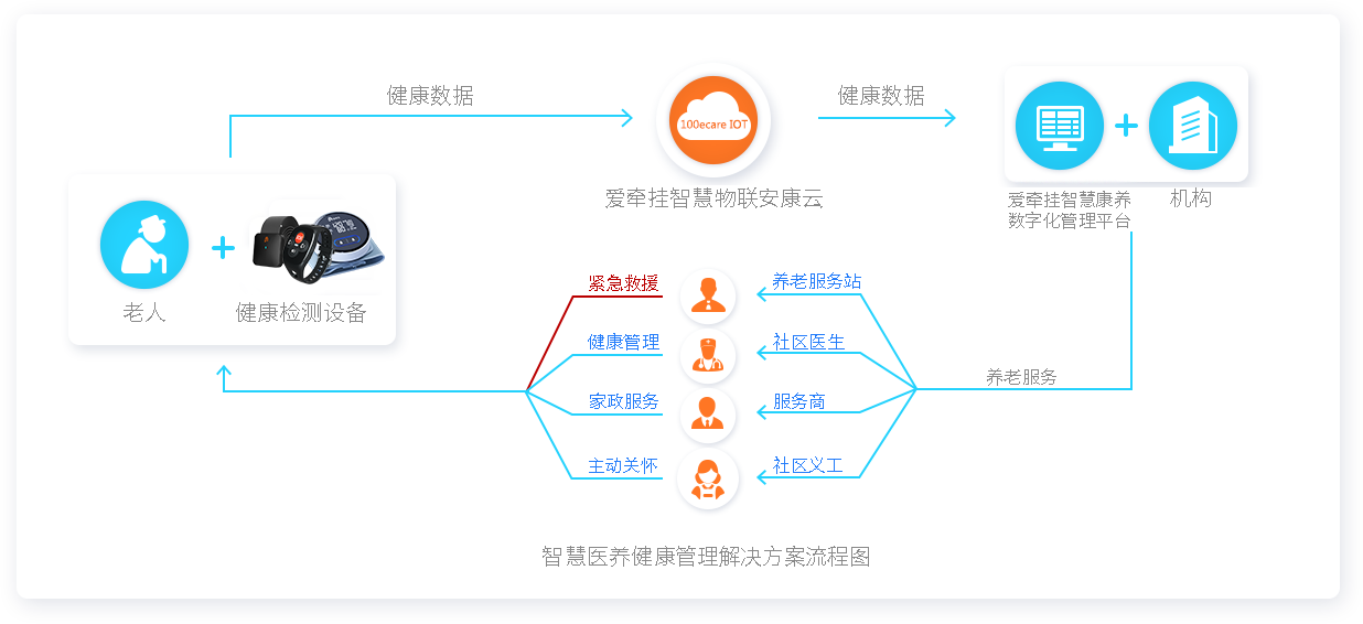成熟的健康信息化管理模块帮助服务机构构建健康大数据,为后续服务延展提供有效数据支持。依托爱牵挂智慧物联安康云,搭配爱牵挂远程智护终端,帮助服务机构顺应医养结合大趋势,构建围绕安全与健康的智能化服务体系。
