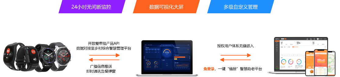平台已完成七大管理子系统模块开发,可直接把养老智能设备的数据和预警通知传输到村居智慧总控平台,实现数据互联互通、资源共享。村居无需二次登陆,只需在总控平台对用户与养老智能设备建立绑定关系,即可对接用户落地服务。